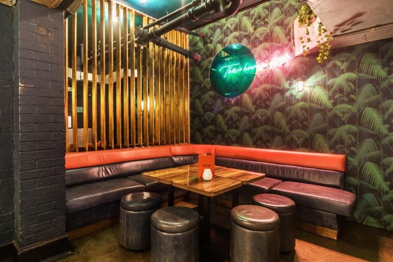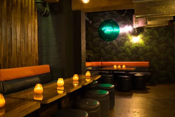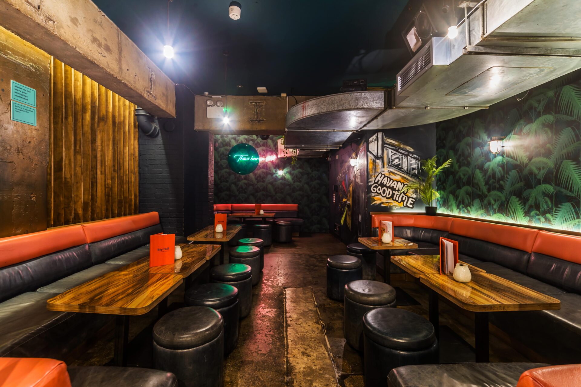 Discover the Green Room, tucked away at the rear of the venue within a charming wooden archway. Adorned with tropical wallpaper and ambient neon lighting, this exclusive space offers an intimate setting for any festive occasion.