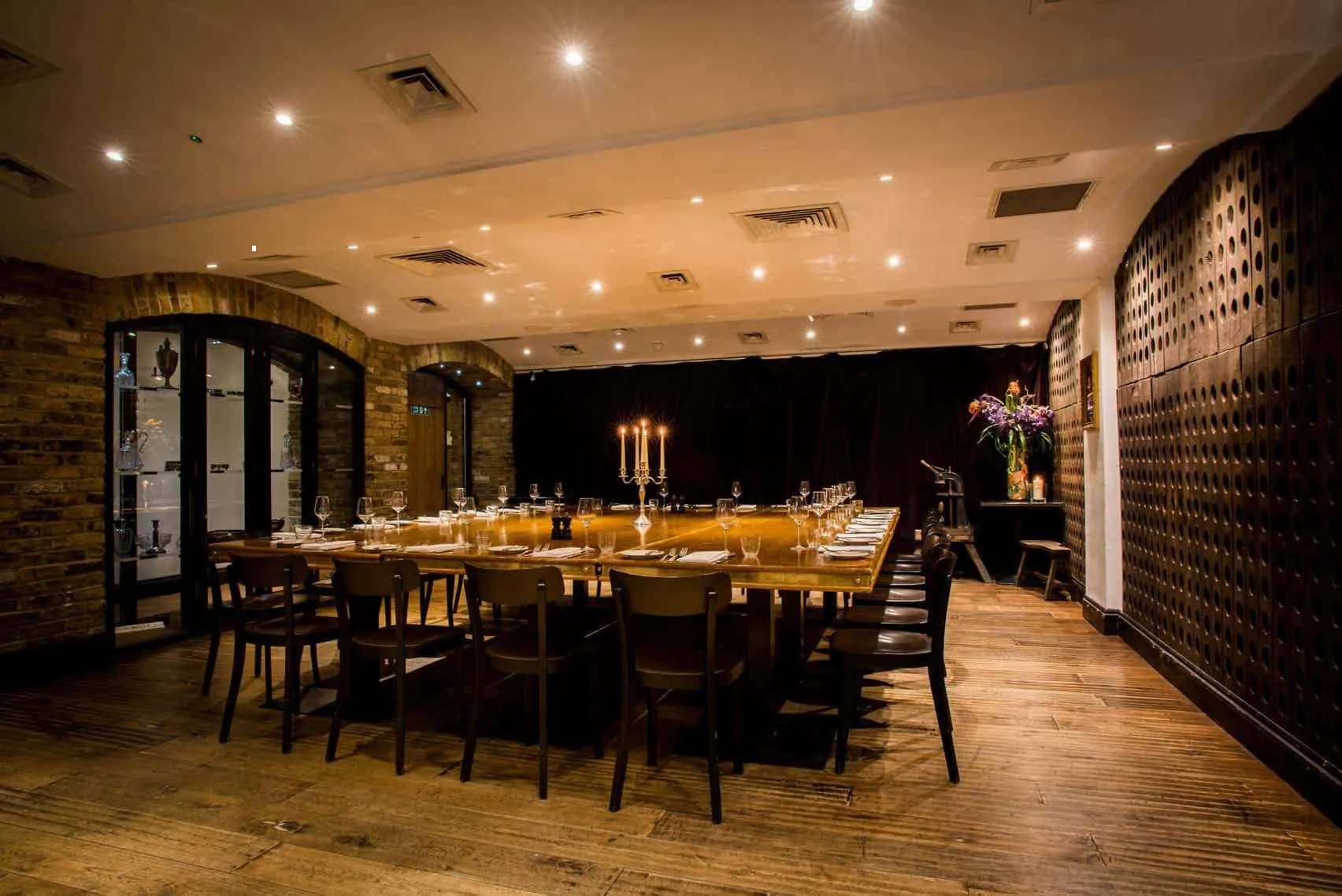 Ideal for private dining, the space can accommodate up to 22 guests at a long table, 32 guests at a horseshoe-shaped table, and up to 50 guests at round tables.