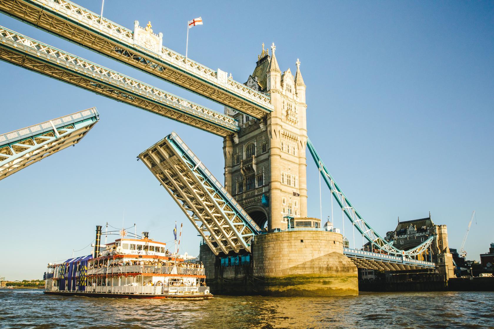 Impress your guests with the ever-changing and enchanting backdrop of London’s iconic landmarks while sailing on this expansive replica 19th-century paddle steamer. Embarking or disembarking at Tower Pier, guests will be captivated as Tower Bridge is raised to allow the Dixie Queen to pass, briefly halting London’s bustling traffic. The cruise takes you past Canary Wharf and historic Greenwich, around The O2 peninsula, and through the Thames Barrier.