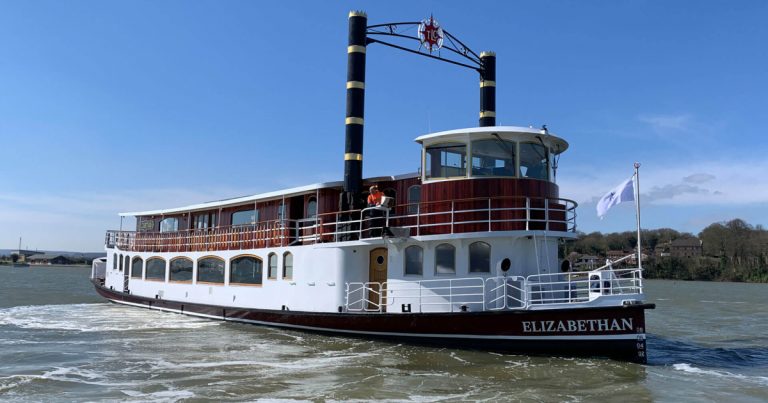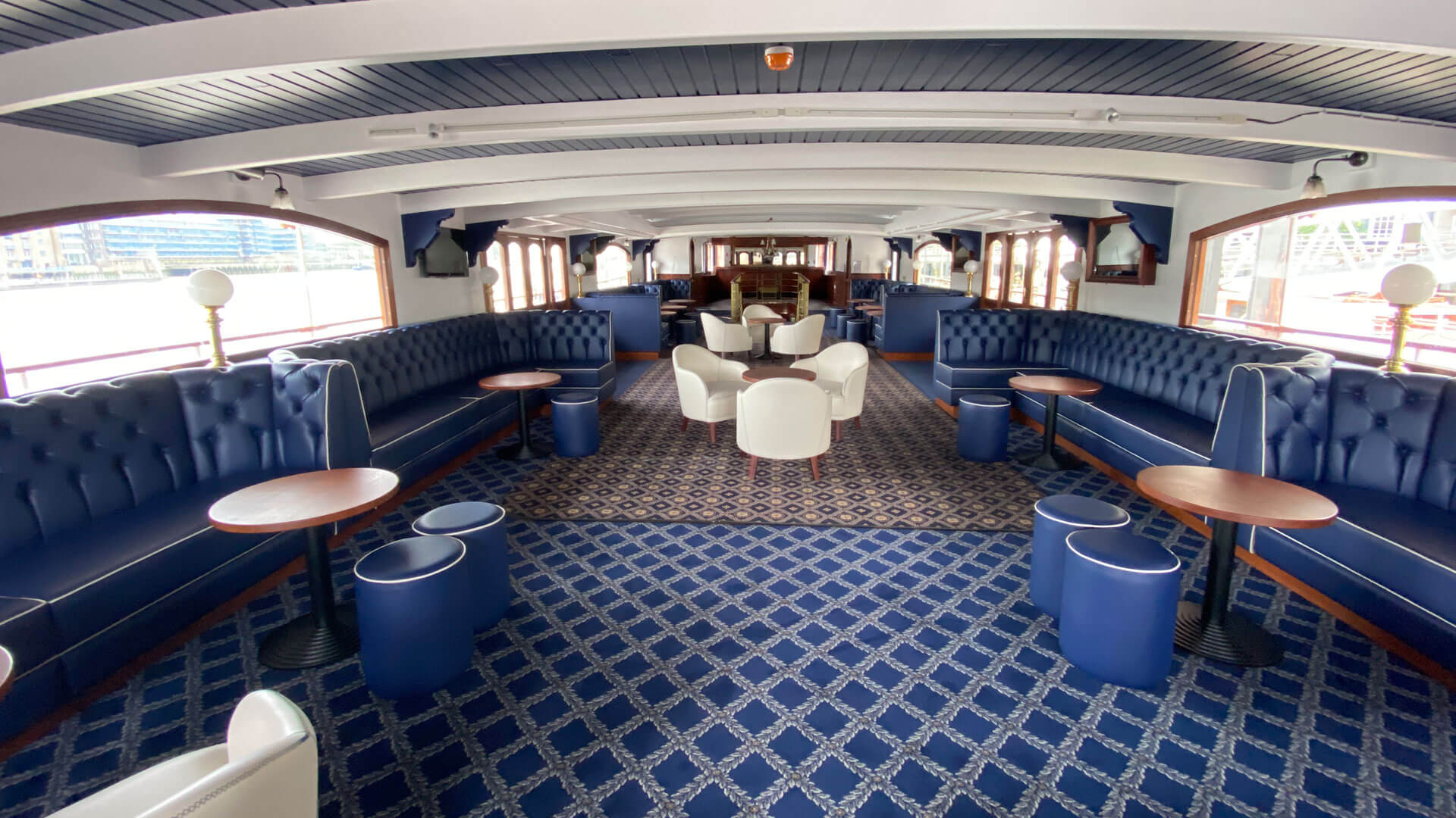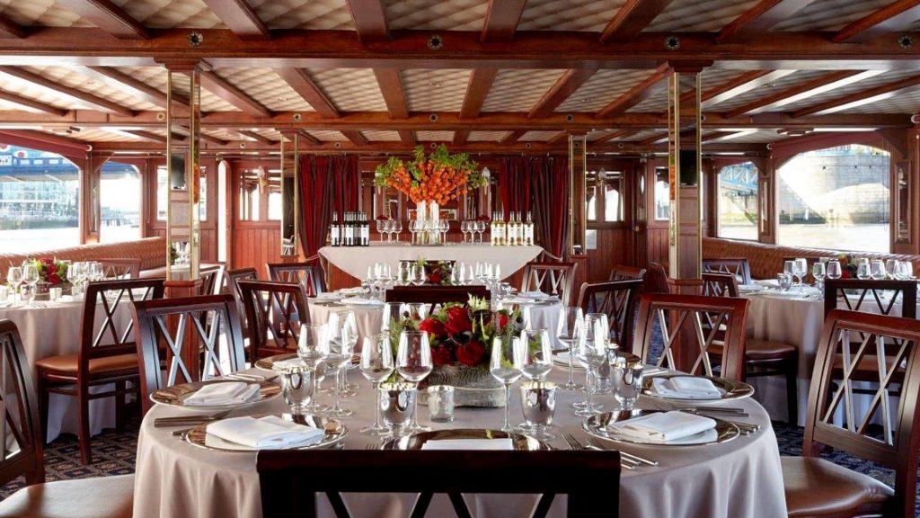 Following a comprehensive refurbishment in 2020, the Elizabethan boasts a spacious upper deck offering a versatile setting for guests to socialize, host presentations, dine, or dance beneath the stars, thanks to its expansive retractable roof. The air-conditioned saloon features wooden paneling and luxurious carpets, complemented by breathtaking views through generously sized windows installed with care during a half-million pound refit to preserve the vessel’s graceful lines.