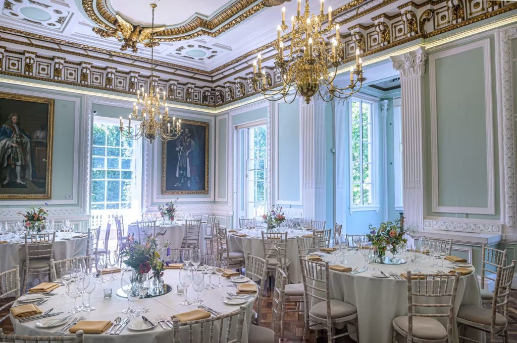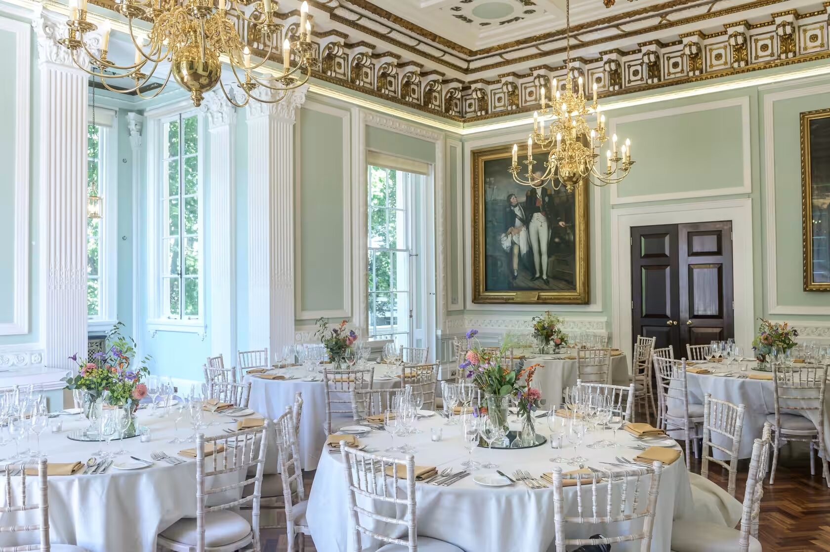 Among these distinguished spaces, the Council Room stands out as a grand and traditional setting, adorned with magnificent paintings on loan from the National Portrait Gallery. Bathed in natural light streaming through bay windows overlooking the serene gardens of Carlton House Terrace and the majestic Duke of York statue up to Waterloo Place, the Council Room showcases its impressive features, including a splendid ceiling, elegant chandeliers, and impeccably varnished floors.