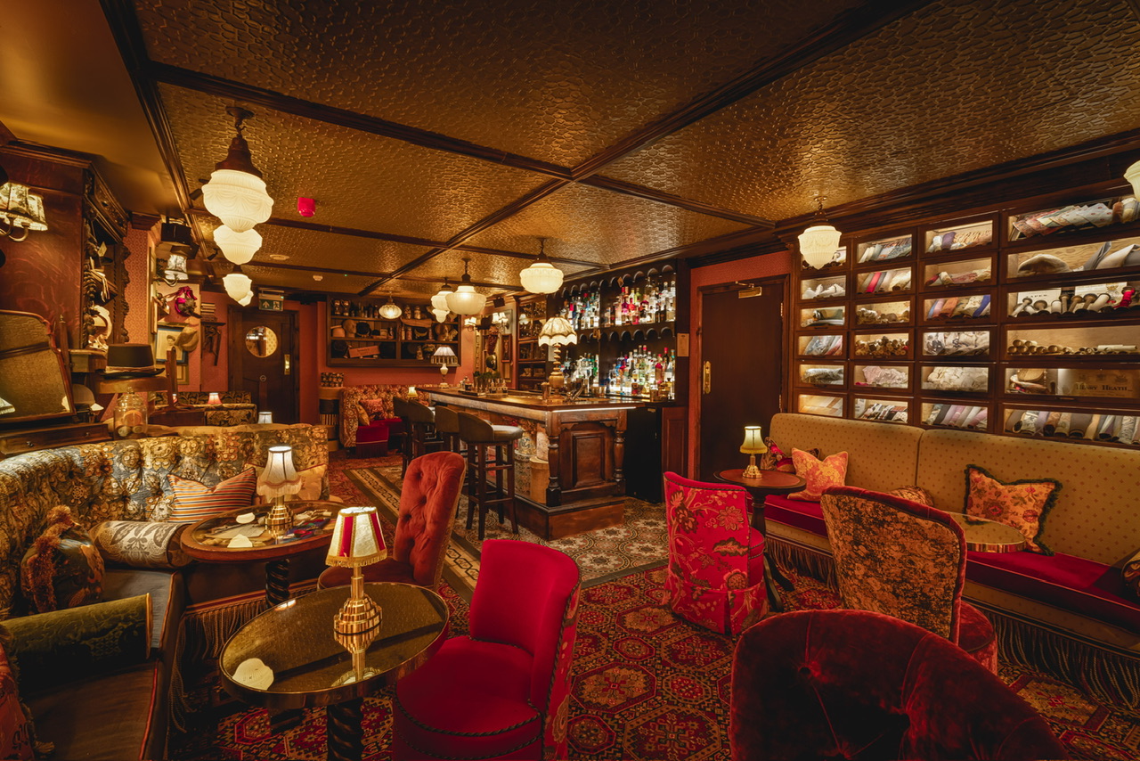 Nestled beneath the lively Hat Tavern, a lavish space awaits, merging exquisite millinery with exceptional gin offerings – The Gin Club. Accessible through a discreet entrance, this exclusive retreat features one of Mr. Fogg’s most extensive collections of fine gins. Enhanced with gold leaf ceilings, bronze lighting fixtures, and showcases displaying hats, The Gin Club exudes sophistication. Here, a bar crafted from a repurposed milliners’ bench serves up impeccable gin libations.