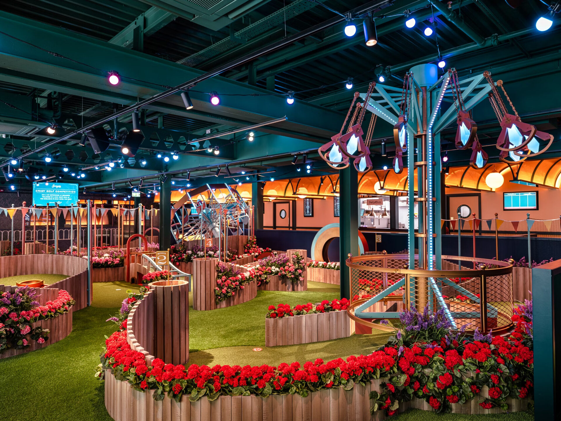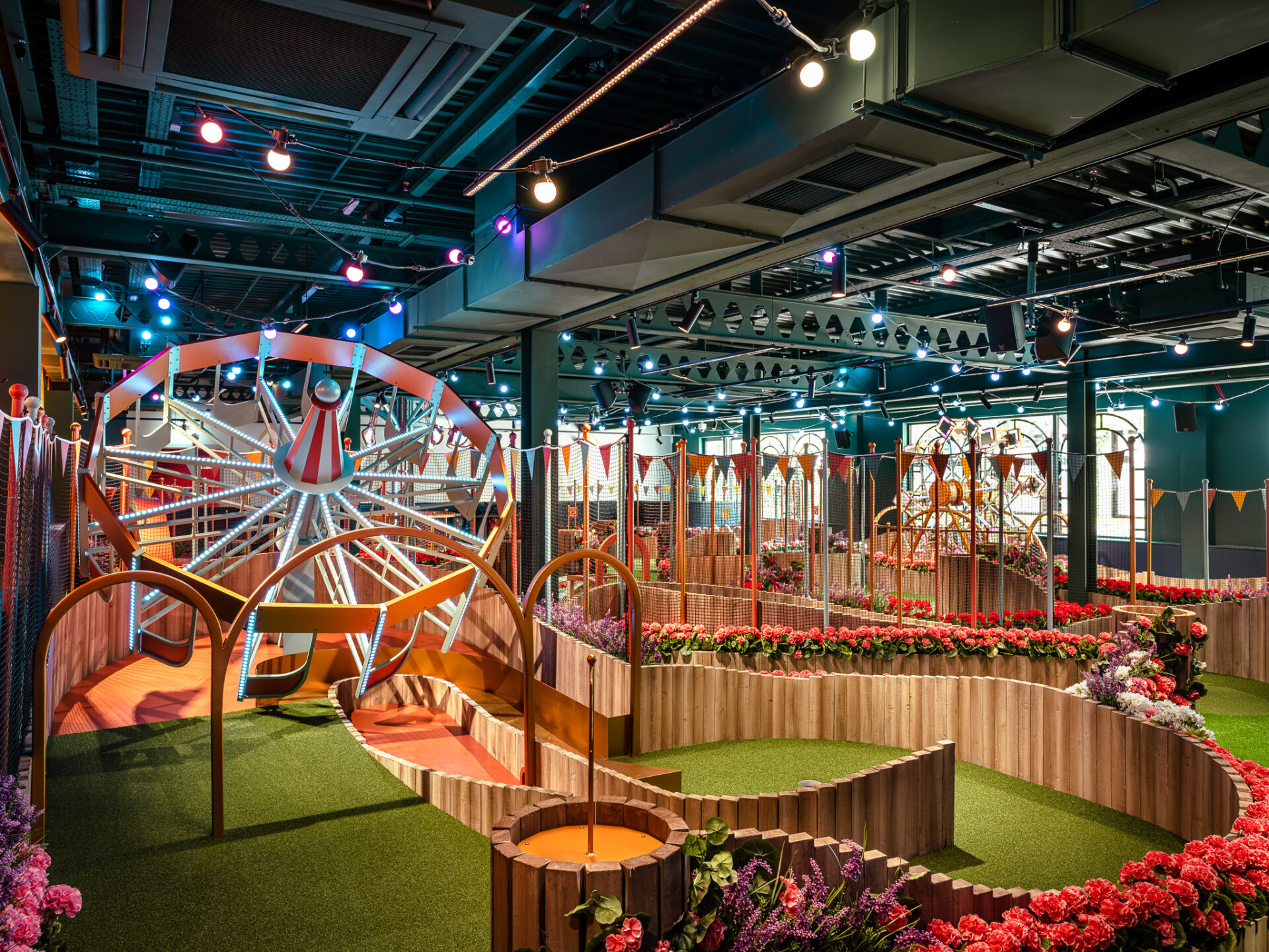 Nestled next to the Meteorite Course, The Boathouse is a striking semi-private room with crittall frontage and mural-covered walls, making it an ideal setting for parties and group gatherings. Be sure to explore the hatch connecting The Boathouse to the Fairground Bar, offering the perfect setup to ensure an uninterrupted flow of cocktails!
