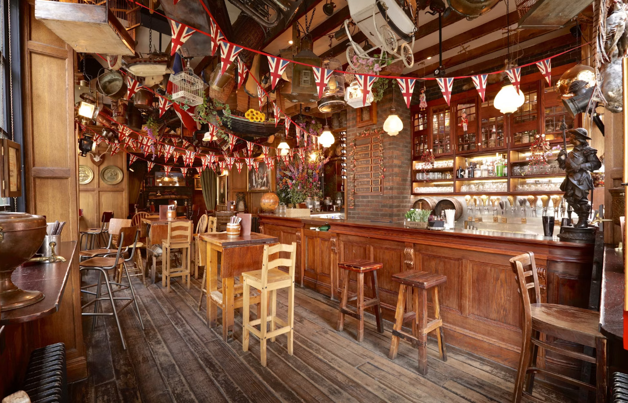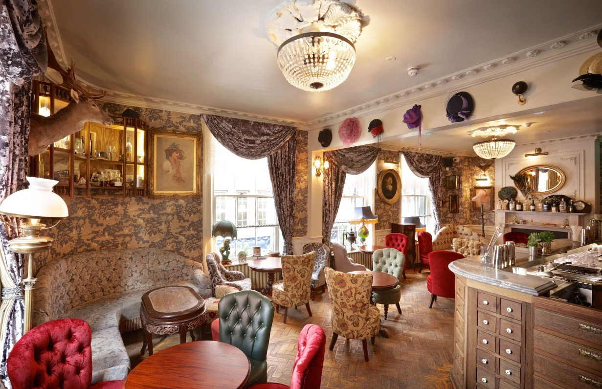 Explore the world of spirits at Mr. Fogg’s Gin Parlour, boasting an extensive array of over 150 gins, accompanied by a selection of tonics and botanicals. The sophisticated space features a curated collection ranging from well-known favorites to rare and distinctive gins. Adjacent to the gin room, the parlour is adorned with elegant, traditionally upholstered furniture and an assortment of eclectic trinkets adorning the walls.
