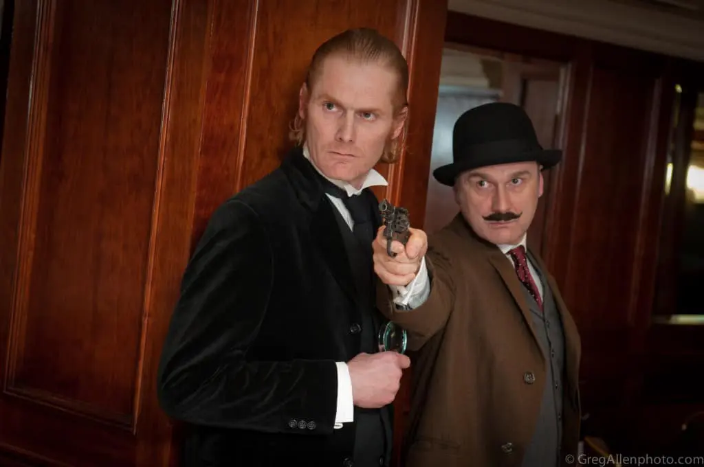 As you enjoy a complimentary glass of Prosecco and all-inclusive drinks in a private dining room, our fully-costumed detective enters to break the dramatic news.